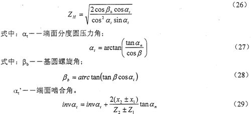 節(jié)點(diǎn)區(qū)域系數(shù)ZH是考慮節(jié)點(diǎn)處齒廓曲率對接觸應(yīng)力的影響,并將分度圓上切向力折算為節(jié)圓上法向力的系數(shù)。ZH數(shù)值可由式(26)計(jì)算得出。