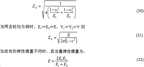 彈性系數(shù)ZE是用以考慮霉?fàn)彈性模量E和泊桑比v對赫茲應(yīng)力的影響。其數(shù)值可按實(shí)際材料彈性模量E和泊桑比v由式(30)計(jì)算得出。