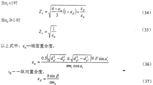 重合度系數(shù)Zε是用以考慮重合度對單位齒寬載荷的影響。Zε可由式(33)、(34)、(35)計(jì)算得出。
