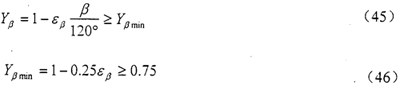 螺旋角系數(shù)Yβ是考慮螺旋角造成的接觸線傾斜對齒根應(yīng)力產(chǎn)生影響的系數(shù)。其數(shù)值可以通過式(45)和(46)計(jì)算。