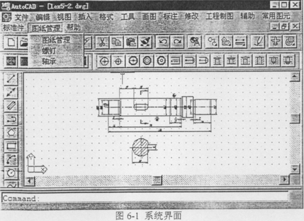 減速機(jī)計(jì)算機(jī)輔助設(shè)計(jì)、繪圖及圖紙管理系統(tǒng)主要包括MCADDS子系統(tǒng)和減速機(jī)CAD子系統(tǒng)二大部分,MCADDS系統(tǒng)是一個相對通用的圖形設(shè)計(jì)與圖紙管理系統(tǒng),適用于各種機(jī)械產(chǎn)品,包括符合國家標(biāo)準(zhǔn)的繪圖平臺、基于事物特性表的通標(biāo)件庫和面向信息集成的圖紙管理等三個模塊;減速機(jī)CAD系統(tǒng)是針對減速機(jī)的設(shè)計(jì)計(jì)算開發(fā)的,對零部件具有通用性,包括齒輪嚙合校核、齒輪傳動系統(tǒng)的設(shè)計(jì)與校核。圖6-1為MCADDS系統(tǒng)界面。該系統(tǒng)的主要內(nèi)容如下: