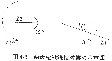 設(shè)兩齒輪的軸線分別為z1,z2,與之固連的坐標(biāo)系分別為S1,S2,轉(zhuǎn)動(dòng)角速度分別為ω1,ω2,兩軸線交角為θ。現(xiàn)暫不考慮兩齒輪的嚙合運(yùn)動(dòng),只考察兩齒輪的相對(duì)擺動(dòng),為使z2固定不動(dòng),可假設(shè)給系統(tǒng)添加一個(gè)繞z2軸且與ω2大小相同、方向相反的運(yùn)動(dòng),如圖4-5所示。則與齒輪固連的坐標(biāo)系S1相對(duì)于S2的運(yùn)動(dòng)可以描述為繞z1軸的自轉(zhuǎn)與繞z2軸的公轉(zhuǎn)。