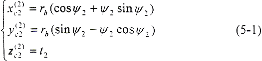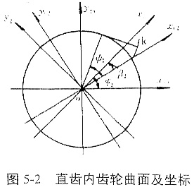 內(nèi)齒輪輪齒為直齒,其端面齒形及坐標(biāo)關(guān)系如圖5-2所示。設(shè)端面齒廓線為漸開線,xc2坐標(biāo)通過漸開線在基圓上的起點(diǎn),在(o,xc2,yc2,zc2)坐標(biāo)下的齒面方程為