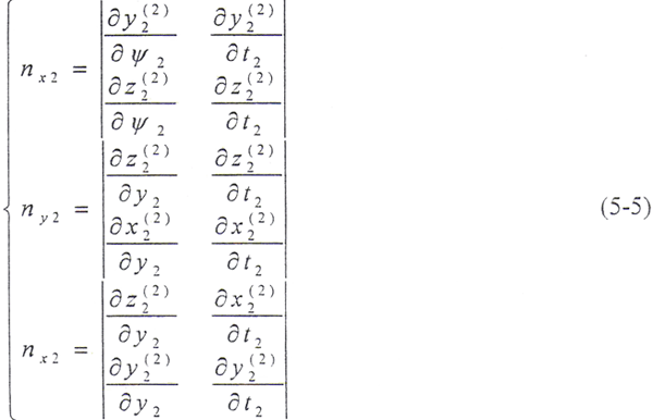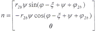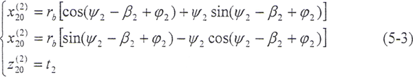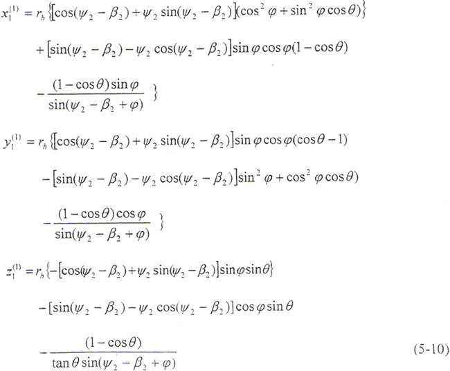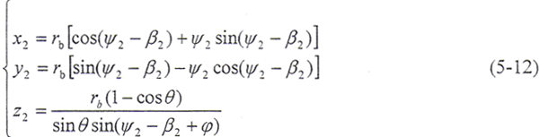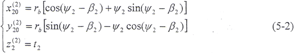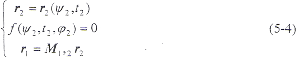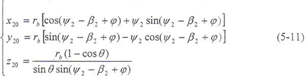 令φ12=φ,將(5-2)式及由(5-8)式解出的t2代入(5-9)式,即可得到以ψ2、φ為參變量的外齒輪齒面方程: