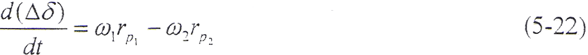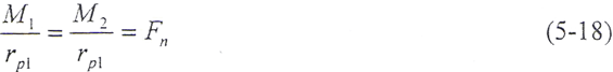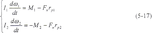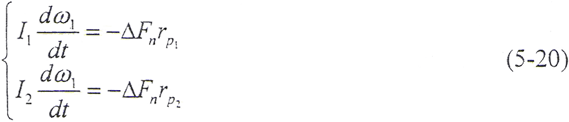 如果在t=0的瞬時(shí),由于干擾載荷的作用,輪齒的變形量增大△δ,則齒上的載荷也獎(jiǎng)增加△Fn,當(dāng)轉(zhuǎn)矩M1、M2為定值時(shí),由齒輪的平衡條件可知,齒輪的角速度ω將發(fā)生周期性變化,而載荷和變形也以同一頻率變化。由(5-17)式和(5-18)式,得