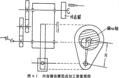 目前,在推桿減速器的批量生產(chǎn)中,其內(nèi)齒圈齒廓的加工采用的都是范成加工方法,加工的夾具及刀具的相對(duì)運(yùn)動(dòng)完全模擬減速器的運(yùn)動(dòng)。激波器的偏心距e由一個(gè)偏心軸的偏心距e來實(shí)現(xiàn),激波器的半徑Tb與內(nèi)滾子半徑Tz之和由偏心軸的幾何中心至固定點(diǎn)的距離R來實(shí)現(xiàn),傳動(dòng)比由掛輪的傳動(dòng)比來實(shí)現(xiàn),如圖4.1所示。