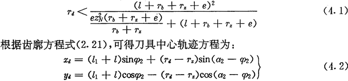 由上面可知,用數(shù)控加工齒廓時(shí),應(yīng)求出圓插刀中心的軌跡,它是被加工內(nèi)齒圈齒廓曲線的內(nèi)法向等距線,如圖4.3所示。圓插刀的半徑可不等于實(shí)際推桿減速器中滾子的半徑,只要刀具半徑Td小于內(nèi)齒圈齒廓在齒根部的最小曲率半徑,在加工過程中不會(huì)發(fā)生切削干涉即可。對(duì)于激波器為偏心圓的推桿減速器,根據(jù)(2.35)式,可得不發(fā)生切削干涉的條件為: