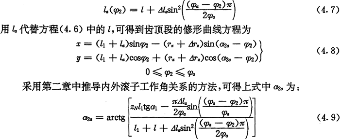 上式中l(wèi)1、a2與φ2的關(guān)系仍為式(2.36)、(2.37)及(2.38),因?yàn)檫@些關(guān)系式中的Tz為內(nèi)滾子半徑,故不變。中段修形范圍是: