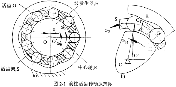 滾柱活齒傳動(dòng)系統(tǒng)(見(jiàn)圖2-la)主要由波發(fā)生器H、活齒G、活齒架S、中心輪R四個(gè)部分組成。如圖2-lb所示,滾柱活齒傳動(dòng)系統(tǒng)在工作時(shí),輸入驅(qū)動(dòng)力后,輸入軸以等角速度ωH,逆時(shí)針旋轉(zhuǎn),從而帶動(dòng)波發(fā)生器使其幾何中心O′繞旋轉(zhuǎn)中心O以同樣角速度旋轉(zhuǎn),波發(fā)生器半徑變化的輪廓曲線(xiàn)產(chǎn)生徑向推力,迫使與中心輪工作齒廓接觸的諸活齒,在沿活齒架徑向?qū)Р垡苿?dòng)的同時(shí),沿著中心輪工作齒廓滑滾,并通過(guò)活齒架的徑向?qū)Р弁苿?dòng)活齒架以勻速ωS逆時(shí)針轉(zhuǎn)動(dòng),于是滾柱活齒傳動(dòng)完成了輸入速度ωH、輸出速度ωS的轉(zhuǎn)速變換運(yùn)動(dòng)。而與中心輪非工作齒廓接觸的諸滾柱活齒,在活齒架徑向?qū)Р弁苿?dòng)下,順序地返回到導(dǎo)槽內(nèi)工作起始位置,從而分別完成了各自的運(yùn)動(dòng)循環(huán)。