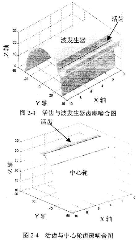 采用相同算法得到活齒與中心輪嚙合時(shí)齒廓曲面的三維圖形(圖2-4 ),同樣可見(jiàn)其接觸線(xiàn)也是一條平行于回轉(zhuǎn)軸的直線(xiàn)。