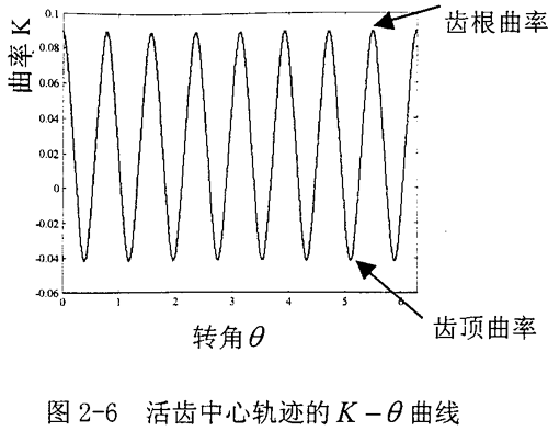 (1)由圖2-6中K-θ曲線(xiàn)可以看出,中心輪每一個(gè)齒在齒根處曲率最大,曲率半徑最小。沿著齒廓上升的過(guò)程中曲率減小到零后,繼續(xù)減小為負(fù)值。到達(dá)齒頂時(shí),曲率最小。