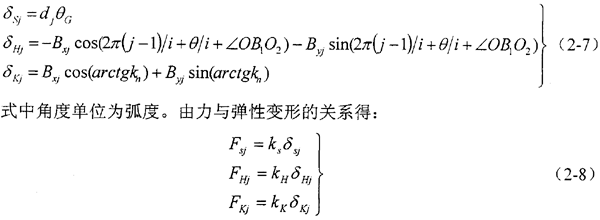 考慮變形協(xié)調(diào)條件,設(shè)第j個(gè)活齒的接觸變形量分別為δHj,δKj和δSj,導(dǎo)致活齒中心與旋轉(zhuǎn)中心O的連線(xiàn)OB1轉(zhuǎn)過(guò)微小角度θG,反映在坐標(biāo)系中,就是活齒中心B在水平和垂直兩方向微小的位移Bxj和Byj,可列: