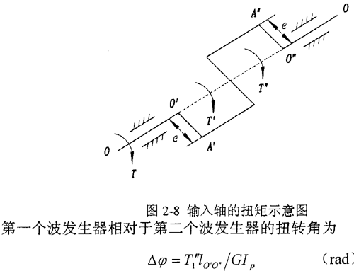 在實(shí)際應(yīng)用中,為平衡掉負(fù)載對(duì)支承的徑向作用,一般采用180°對(duì)稱(chēng)布置的雙排結(jié)構(gòu),兩排活齒共用一個(gè)活齒架。圖2-8 中O′a′、O″A″分別表示第一排、第二排波發(fā)生器的偏心距。在以下分析中約定:上角標(biāo)“′”表示第一排活齒傳動(dòng)的參數(shù),上角標(biāo)“″”表示第二排活齒傳動(dòng)的參數(shù)。T1、T1′和T1″分別表示輸入軸上的總輸入力矩、第一和第二個(gè)波發(fā)生器分擔(dān)的輸入力矩。在輸入力矩的作用下,輸入軸和波發(fā)生器發(fā)生扭轉(zhuǎn)變形使兩波發(fā)生器的相位差由理論的180°有了一個(gè)相對(duì)的變化△φ,從而使兩排活齒的受力情況略有不同,所承擔(dān)的扭矩也不同。為此,引入載荷傳遞不均勻系數(shù)Kp,設(shè)第二排活齒傳遞的扭矩為KpT2,則第一排活齒傳遞扭矩為(l-KP)T2,其中T2為輸出軸上輸出的總扭矩。