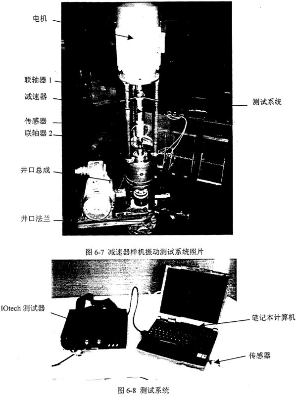 由于電動潛油螺桿泵采油系統(tǒng)的效率從本質(zhì)上要遠高于傳統(tǒng)的游梁式抽油機系統(tǒng)和地面驅(qū)動螺桿泵采油系統(tǒng),而減速器作為電動潛油螺桿泵采油系統(tǒng)的一個組成部分,其效率提升對整個系統(tǒng)的效率提升作用不十分明顯,另一方面,立式的試驗系統(tǒng)結(jié)構(gòu)僅螺桿泵、減速器和電機三項的地面總高度就達到3.128m,如果測試樣機的效率,還要在樣機的輸入和輸出端上各安裝一個轉(zhuǎn)矩轉(zhuǎn)速儀,從而使得整個系統(tǒng)的地面高度達到4m多,己超出了實驗室吊車的吊裝高度。所以,本章不進行效率測試,只進行振動試驗研究。