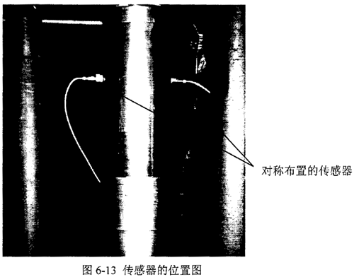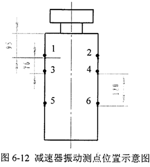 測點布置方案是關(guān)系到測量結(jié)果的一件重要工作,應(yīng)選擇信號傳遞路線最短、最能反應(yīng)減速器振動的部位作為測點。本實驗中測點對稱布置在減速器外殼與活齒中點在同一水平線的兩個點1 、2 上,用以采集第一排活齒引起殼體振動的信號。同樣,測點3 、4 采集第二排活齒引起殼體振動的信號。測點5 、6 布置在輸出軸的支承軸承所對應(yīng)的殼體位置上,用以測量輸出軸軸承座的徑向振動。各測點的位置示意圖見圖6-12,實際測試時傳感器的位置見圖6-13。