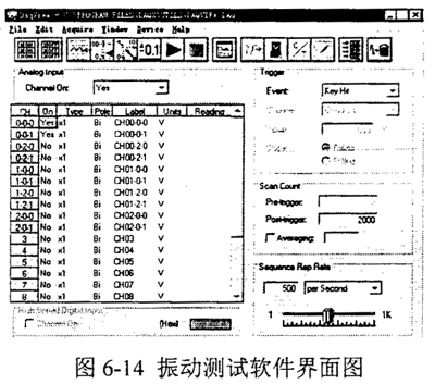 6.2.6.2振動測試數(shù)據(jù)的處理,振動信號的采集和外理軟件的性能直接關(guān)系到測試結(jié)果的準確性,本實驗采用的是IOtech開發(fā)的軟件DaqView7.2,它與IOtech測試系統(tǒng)具有很好的兼容性,軟件界面見圖6-14。