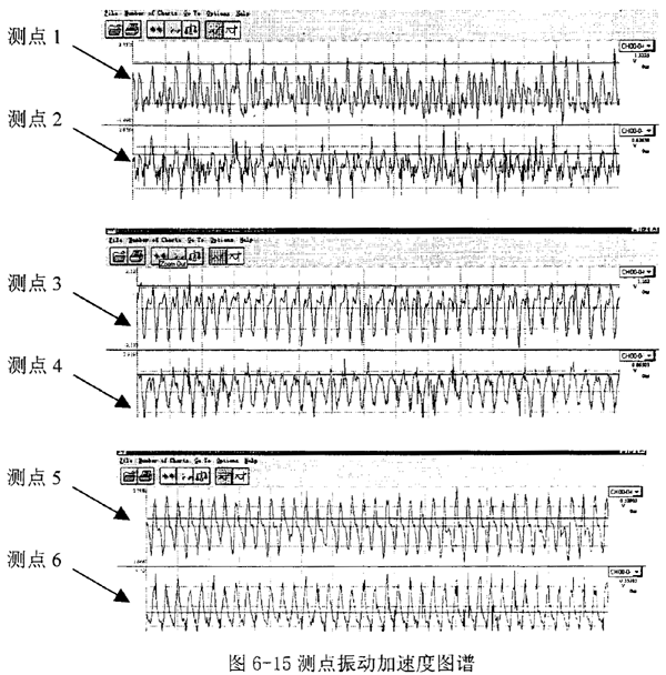 由于試驗井測試加載條件所限(無變頻率調(diào)速裝置及試驗用反轉(zhuǎn)螺桿泵定子、轉(zhuǎn)子間隙過大),對樣機只能在輸入轉(zhuǎn)速n=1470rpm、輸出扭矩T=50,195,330N·m工況下進行振動測試。設(shè)每秒鐘采樣點為500個,每個樣本采集時間為4秒。表6-1所示是在不同載荷情況下,在6個測振點所測到的最大加速度值。