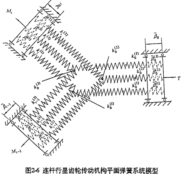 國科2-3所示為一多相并列連桿行星齒輪過約束機構(gòu)。為了得到與靜不定次數(shù)相對應(yīng)的S個補充方程,必考慮各構(gòu)件間、各相機構(gòu)間、以及多齒承載的位移協(xié)調(diào)要求,這是分析具有多余聯(lián)系體系受力的一般方法。為此,可先將機構(gòu)轉(zhuǎn)化為受力、變形等效的結(jié)構(gòu)(幾何不變體系),然后用結(jié)構(gòu)力學(xué)的方法分析系統(tǒng)、構(gòu)件位移協(xié)調(diào)的條件。