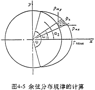 確定作用于結(jié)構(gòu)邊界上的非均布載荷是一件復(fù)雜工作,往往需要進(jìn)行一些較復(fù)雜的計(jì)算,譬如采用接觸問題有限元法進(jìn)行計(jì)算。在實(shí)際應(yīng)用中常采用一些近似的假設(shè)規(guī)律來代替這些復(fù)雜的未知分布規(guī)律。對(duì)于軸承載荷,一般假設(shè)沿周邊按余弦規(guī)律分布如圖4-5所示,即