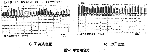 理想情況下,嚙合力的極小值在φ=0°、180°產(chǎn)生,極大值在φ=90°、270°產(chǎn)生,造成位置偏離的影響因素主要有軸承剛度,齒板剛度,嚙合角以及輸入轉(zhuǎn)速、傳動(dòng)比等等。其中軸承剛度的影響極大。在死點(diǎn)的嚙合力也產(chǎn)不并一定為零。哈合力可能為負(fù)值。為負(fù)值時(shí),將阻礙傳動(dòng)的正常轉(zhuǎn)動(dòng),產(chǎn)生內(nèi)齒輪副的干涉現(xiàn)象。并引起減速器沖擊振動(dòng)。因此,按照嚙合力過死點(diǎn)時(shí)為零的假設(shè)分布規(guī)律以及嚙合力為常數(shù)分布規(guī)律的模型分析,所得結(jié)果都是不可靠的。圖5-6是齒板死點(diǎn)位置180°及另一齒板位于超前120°嚙合點(diǎn)的單齒嚙合圖的測試結(jié)果。圖中每一棒線代表被測齒受嚙合力作用一次。比較兩圖可知,死點(diǎn)位置嚙合力總體水平低于120°位置時(shí)的嚙合力總體水平,與理論分析計(jì)算的結(jié)果完全吻合。
