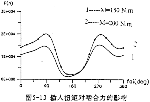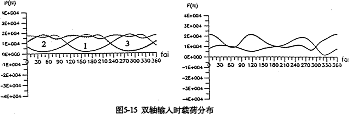 由上式可知,當(dāng)減速器幾何參數(shù)一確定,e及r2均為已知參數(shù)。因此增大M,必須引起左邊的行星軸承載荷F(j)Lx,F(xiàn)(j)1y增大使方程式(5-30)平衡。圖5-13是輸入扭矩分別為150N.m及200N.m時(shí)的嚙合圖。由圖可看出,負(fù)載增加,嚙合力幅值增大。采用雙軸輸入時(shí)可降低各載荷的幅值,使其均衡化。圖5-14是單軸輸入時(shí)的嚙合力及行星軸承載荷。圖5-15是雙軸輸入時(shí)的嚙合力及行星軸承載荷。從兩圖比較得知,無(wú)論是嚙合力,還是軸承載荷,采用雙軸輸入后其變化均趨于平緩,幅值降低很多,三相嚙合力趨于均衡,而且負(fù)向嚙合力已消除。