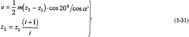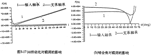 由上式知,當(dāng)齒數(shù)差Z2-Z1越小或傳動(dòng)比i越大時(shí),偏心距e越。粔毫窃酱髸r(shí),偏心距e越大,則選用的行星軸承尺寸大,齒板高速軸承孔徑也就大。圖5-17是傳動(dòng)比、壓力角、以減速器行星軸承載荷的影響。由圖可見(jiàn),傳動(dòng)比的變化對(duì)減速器的動(dòng)力性能影響極大;傳動(dòng)比越大,則偏心距越小。由式(5-30)分析得,行星軸承載荷必須大。壓力角的變化,對(duì)行星軸承載荷影響小得多。