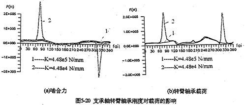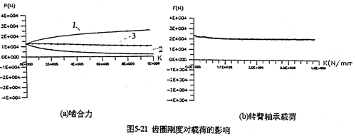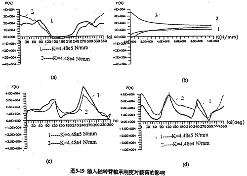 只考慮行星軸承變形及齒板變形時(shí),影響三環(huán)減速器載荷特性的剛度,主要是行星軸承剛度、和內(nèi)齒圈的變形剛度。軸承剛度與軸承材料、間隙、油膜等很多因素有關(guān)。圖5-19是輸入軸行星軸承剛度對(duì)嚙合力及行星軸承載荷的影響。當(dāng)輸入行星軸承剛度小一個(gè)數(shù)量級(jí)時(shí),負(fù)向嚙合力區(qū)域增大(見(jiàn)圖5-19a);隨剛度減小、各相嚙合力越不均恒(圖5-19b),輸入軸行星軸承剛度的影響比輸入軸行星軸承剛度更大,見(jiàn)圖5-20所示。嚙合力及各行星軸承載荷在軸承剛度較小的情況時(shí),都出現(xiàn)正常載荷的10倍以上的沖擊現(xiàn)象,沖擊產(chǎn)生的位置隨剛度變化不同。內(nèi)齒圈剛度對(duì)載荷的影響與行星軸承剛度相反(見(jiàn)圖5-21所錄)。當(dāng)剛度越小時(shí),三相齒板的嚙合力越均恒(見(jiàn)圖5-21a),而且行星軸承載荷幅值基本上不變(見(jiàn)圖5-21b)。同此可推知,減小三環(huán)減速器振動(dòng)的途徑之一就是提高行星軸承剛度,減小內(nèi)齒圈剛度。這可以通過(guò)對(duì)行星軸承進(jìn)行預(yù)緊,和采用軟齒面或大柔度齒圈的辦法,以使嚙合力和行星軸承載荷均衡化,以達(dá)到減振降噪的目的。