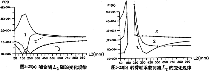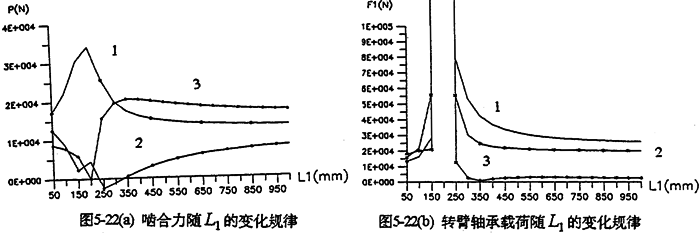 各軸水平布置時(shí),軸間的中心距變化,將引起各載荷大小幅值、規(guī)律均發(fā)生變化。圖5-22是輸入軸相對(duì)輸出軸位置變化時(shí),減速器的嚙合力及軸承載荷變化情況。由圖可知,當(dāng)輸入軸與支承軸中心距(L2=200mm)很小時(shí),三齒板的嚙合力分配很不均衡,隨著L1的增加嚙合力趨于均衡(見(jiàn)圖5-22a)。行星軸承載荷變化情況見(jiàn)圖5-22b所示。
