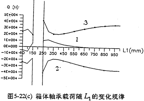 當(dāng)|L1-L2|≤50mm時(shí),載荷產(chǎn)生沖擊為無(wú)窮大,L1≥400mm以后,隨著L1的增加,三相行星軸承載荷幅值變化很緩慢,接近于直線分布。但箱體軸承載荷的幅值在L1>350mm后,隨L1增加各相之間的幅值差變大,趨于不均衡狀態(tài)(見(jiàn)圖5-22c)。因此SHQ50型及SHQ63型的三環(huán)減速器的振動(dòng)比SHQ40型的大。