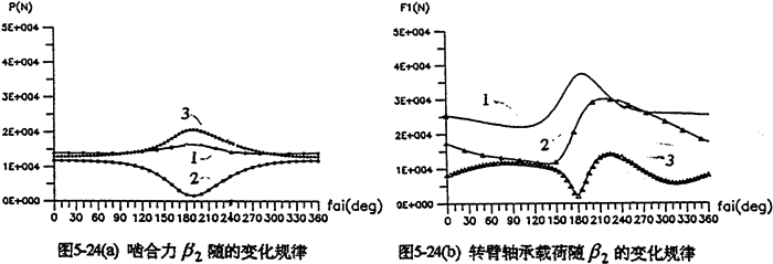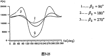 當(dāng)輸入軸與軸出軸的中心距確定后,可通過(guò)調(diào)整支承軸的位置,滿(mǎn)足特殊的空間位置要求,或者設(shè)計(jì)成載荷分布特性最優(yōu)、幅值最小的減速器。圖5-24是中心距L1=400mm、L2=200mm時(shí),支承軸相對(duì)于輸出軸轉(zhuǎn)動(dòng)的角位移β2變化時(shí)嚙合力及行星軸承載荷的分布情況。由圖看出,各種載荷均在180°附近(SHQ偏置式減速器)取得極大值。在0°~90°和270°~360°范圍(Ⅰ、Ⅳ限內(nèi)),三相齒板嚙合力分配很均衡,嚙合沖擊很小。因此。設(shè)計(jì)三環(huán)減速器時(shí),為減小載荷的幅值和各相之間載荷的差值、支承軸應(yīng)盡可能遠(yuǎn)離180°,即不采用三軸心共線的水平位置的結(jié)構(gòu)。圖5-25為幾個(gè)特殊位置的嚙合力隨轉(zhuǎn)角變化的分布規(guī)律。