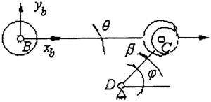 上式中,(xb,yb)是B處的位移量,θ為連桿繞鉸點(diǎn)的轉(zhuǎn)角位移,β為接觸點(diǎn)C在從動(dòng)曲柄軸上繞軸線(xiàn)(D)的轉(zhuǎn)角位移,L為連桿的長(zhǎng)度,見(jiàn)圖3.2。