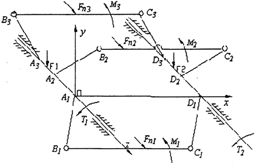 圖3.3是一多相并列雙曲柄機(jī)構(gòu)的結(jié)構(gòu)簡(jiǎn)圖,曲柄軸為輸入軸,其上作用有已知外力F1和未知輸入力矩T1,曲柄軸為支撐軸,其上的外力知T2和外力F2以及作用在連桿B1C1上的合外力Fn1,外力矩M1都是已知的,在任一時(shí)刻t,連桿A1B1與XOZ平面的夾角為φ1,運(yùn)用機(jī)構(gòu)靜態(tài)力學(xué)分析方法[22、29、30、34],對(duì)連桿B1C1可列出受力平衡方程: