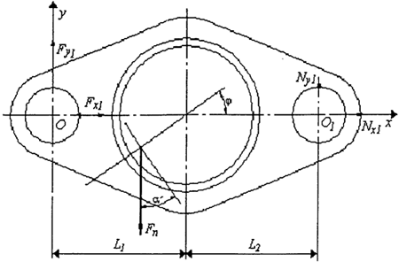 把一個(gè)三相并列雙曲柄機(jī)構(gòu)作為一般情況進(jìn)行受力分析,建立相應(yīng)的數(shù)學(xué)模型,然后分四種狀況進(jìn)行計(jì)算。圖3.4是基本型(低速軸在中間,高速軸兩側(cè)布置)環(huán)板受力情況,左邊的高速軸為輸入軸,輸入力知M,輸入轉(zhuǎn)速為n,中間帶外擺線(xiàn)輪的為輸出軸,右邊的高速軸為中間軸(支撐軸),在齒板上以左邊軸承孔中心B1為坐標(biāo)原點(diǎn)建立坐標(biāo)系0-XYZ,輸入曲軸A1B1與X軸的夾角為φ。
