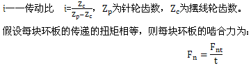 在這里擺線(xiàn)針輪輪齒的受力情況作一個(gè)簡(jiǎn)化。因輪齒上受到的力均通過(guò)擺線(xiàn)輪的節(jié)圓上的一點(diǎn),故可能所有輪齒受到的力簡(jiǎn)化成為一個(gè)合力,與擺線(xiàn)輪齒運(yùn)動(dòng)方向的夾角為α′(即嚙合角)。見(jiàn)圖3.4。