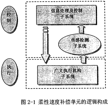 柔性速度補(bǔ)償單元由兩部分組成,包括機(jī)械運(yùn)動(dòng)子系統(tǒng)、信息處理及控制子系統(tǒng),其中后者又包括信息處理與控制、傳感檢測兩部分。其邏輯組成如圖2-l所示。