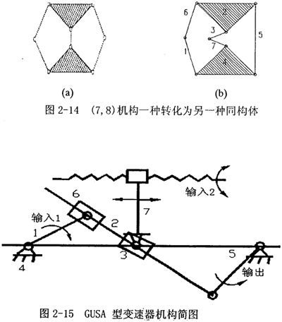 方案三:在眾多已有機(jī)構(gòu)類型篩選當(dāng)中,發(fā)現(xiàn)機(jī)構(gòu)式脈動(dòng)無級變速器中的一種:三相并列連桿式(GUSA)脈動(dòng)無級變速器采用的機(jī)構(gòu)可以供鑒。這咱變速器設(shè)計(jì)原理為:采用三相并列結(jié)構(gòu),作為輸入機(jī)構(gòu)的是相位差為120度的三曲拐曲軸,每個(gè)曲拐帶動(dòng)一套Ⅲ級七桿機(jī)構(gòu),如圖所示是(7,8)圖譜中(1)的一種同構(gòu)機(jī)構(gòu),圖2-14顯示了它的轉(zhuǎn)化和各桿件的標(biāo)號,可以與圖2-15結(jié)構(gòu)簡圖——對應(yīng)。
