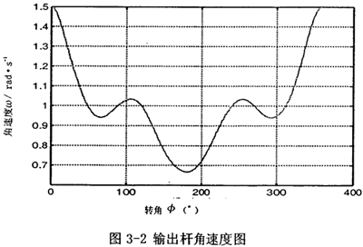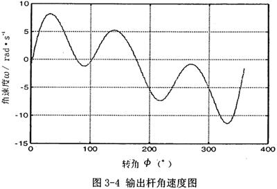 第二種情況 第一輸入速度和第一種情況的速度值相同,現第二輸入經螺旋機構轉化為往復運動后,輸入速度為v=sinθ1(θ1為第一輸入角位移),即為滑塊3的速度,再編程計算,得出結果如圖3-4,圖3-5所示。