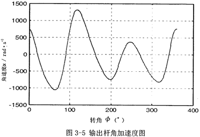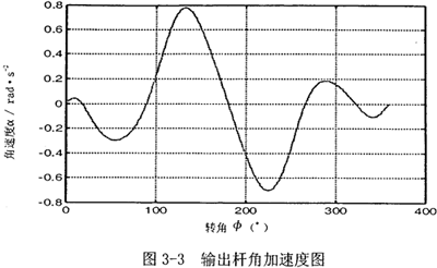 首先由圖3-2可以看到,若機構結構參數設計恰當,并且調整中間滑塊3偏移到合適的位置時,可在一定范圍內,產生一個反向的速度波適度抵消原速度波動。再由圖3-3可知,在未加入第二自由度時,加速度變化值不大,說明阻力矩和電機主動力矩不會受到大的影響,不致導致原機械系統的各項參數發(fā)生大的變化。