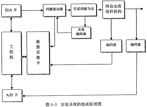 4.數(shù)據(jù)處理:(l)微機將電機位置信號作數(shù)值微分求得電機轉(zhuǎn)速。(2)微機用數(shù)字濾波程序?qū)⒓铀俣刃盘栕鳛V波、數(shù)值積分等處理。如圖5-3所示為實驗系統(tǒng)的組成原理圖: