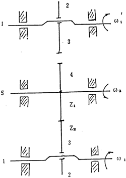 三環(huán)減速器實(shí)質(zhì)上就是一種雙曲柄輸入式、內(nèi)齒輪作圓周平動而外齒輪用于輸出的少齒差行星齒輪傳動機(jī)構(gòu)。原理如圖2-1所示。雙曲柄機(jī)構(gòu)1-1以轉(zhuǎn)速ω1輸入運(yùn)動,通過連桿2及與連桿相固連的內(nèi)齒輪了將運(yùn)動傳給外齒輪4,并通過外齒輪4將運(yùn)動傳遞給5ω2輸出運(yùn)動和動力,其傳動比為: