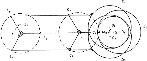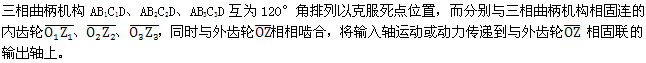 眾所周知,雙曲柄機(jī)構(gòu)的最大缺點(diǎn)就是存在死點(diǎn)位置,即當(dāng)曲柄,與連桿共線時(shí),機(jī)構(gòu)處理運(yùn)動不確定位置,其傳動角為零,機(jī)械無法運(yùn)動。為了克服死點(diǎn)位置,目前已出現(xiàn)了三種解決方法:其一是在同一行星輪上布置多套雙曲柄機(jī)構(gòu)的方法:其二是采用雙曲柄動力輸入式方法;基三是采用多相并列式雙曲柄機(jī)構(gòu)來克服死點(diǎn)的方法。三環(huán)減速器就是用三相并列雙曲柄機(jī)構(gòu)來克服死點(diǎn)位置,如圖2-2所示。