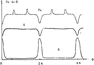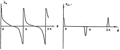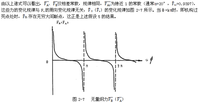 理論上,該力僅在ф=Kπ點(diǎn)產(chǎn)生,而FA、FB將在此點(diǎn)處趨于無窮大?紤]實(shí)際結(jié)構(gòu)的彈性變形等因素,F(xiàn)Br應(yīng)在ф=Kπ的一轉(zhuǎn)角領(lǐng)域內(nèi)ф=Kπ±△ф產(chǎn)生,而FB、FA在該鄰域內(nèi)由正(或負(fù))向峰值過零轉(zhuǎn)變?yōu)樨?fù)(正)向峰值,如圖2-10所示。這是因?yàn)镕B、FA在死點(diǎn)位置附近迅速增大產(chǎn)生的彈性變形也會使環(huán)板產(chǎn)生微小反轉(zhuǎn)角度,而導(dǎo)致FBr的產(chǎn)生,顯然該微小角度領(lǐng)域的大小以及FB、FA所能達(dá)到的峰值決于環(huán)板的剛度。剛度越大,該領(lǐng)域越小,F(xiàn)B、FA峰值越大,F(xiàn)Br的大小與嚙合力及無量綱參數(shù)(γ+β)成正比。一般情況下,高速重載的三環(huán)減速器、環(huán)板機(jī)構(gòu)的剛度嚙合力等均較大,因此死點(diǎn)處受到的沖擊越大,且沖擊脈沖寬度。ǚ幢扔诮撬俣龋ふ耦l率更寬,更易激起廣泛的共振。