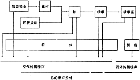 從圖中可知,固體傳播噪聲是由傳遞中的振動激勵(lì)引起的,環(huán)板沖擊及輪齒嚙合振動通過軸、軸承、軸承座傳向箱體和機(jī)座;引起振動而輻射的噪聲通過箱壁向外輻射,此外,由軸的振動引起的噪聲的一部分直接向箱體外輻射。