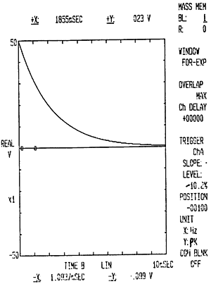 脈沖錘擊信號送入 CF-355中的S通道,響應(yīng)信號送入B通道,對脈沖激勵所加的力窗函數(shù)及內(nèi)觸發(fā)脈沖的方向、數(shù)值大小及位置如圖4-1示,對脈沖響應(yīng)所加的指數(shù)窗函數(shù)如圖4-2示。