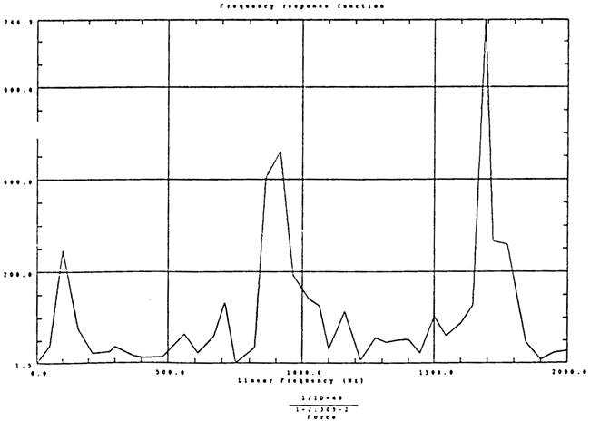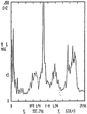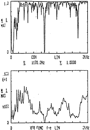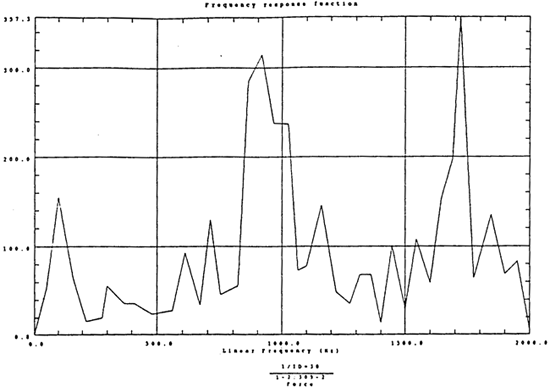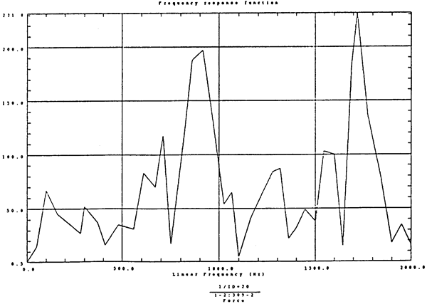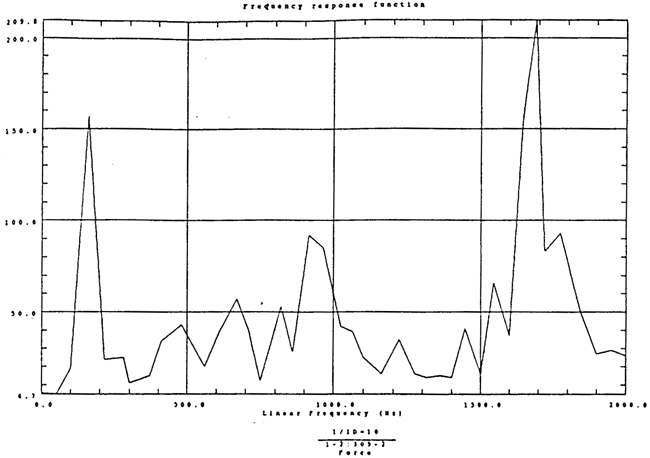 有了脈沖激勵信號和脈沖響應(yīng)信號后,CF-355頻譜分析儀就能計算出測點12X向由于14點X向激勵間的頻響函數(shù)H(ω)及其相干函數(shù),如圖4-5所示。圖4-6是頻響函數(shù)H(ω)的倒數(shù)。