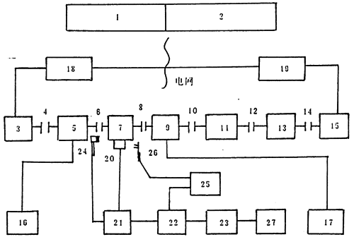 試驗時,通過控制臺1,2調(diào)節(jié)控制系統(tǒng)讓交直流機組18發(fā)出適當?shù)闹绷麟妷菏怪绷鳒y功機3(工作于恒速電動工況)按恒定轉速轉動,通過聯(lián)軸器4,6和輸入轉速扭矩傳感器5與試件7輸放端(高速端)相聯(lián)接。試件7輸出端通過聯(lián)軸器8,10,12,14及輸出扭矩傳感受器9、升速用11、汽車變速箱13而與直流測功機15(工作于恒電流工況)聯(lián)接,驅(qū)使其發(fā)出適當電壓的直流電,再通過交直流機組19將其逆變成為工頻北流電返回電網(wǎng),完成整個電功率封閉閉鏈。