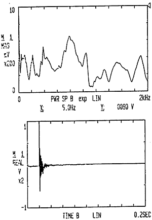 試件7上的振動信號與脈沖激勵的響應信號通過傳感器20取出信號,然后經(jīng)過放大器21放大后,用磁帶記錄儀22記錄并可采用頻譜分析儀23監(jiān)控并分析,而其上的噪聲信號可以通過聲強儀25的測頭26取出信號后送入22和23中用于分析研究。