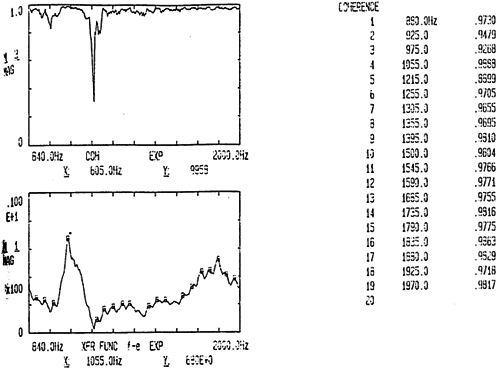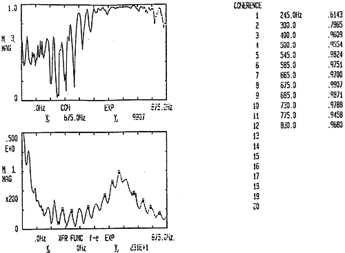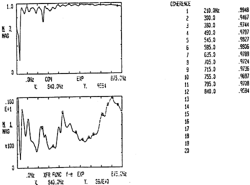 下面我們列出SHQ40振動系統(tǒng)850HZ-2KHZ間各階模態(tài)固有頻率的試驗值。如圖6-13示。圖中左上部為相干函數(shù),左下部圖為頻響函數(shù)圖,而右半圖部分為十三階到三十一階固有頻率值及其相干值。