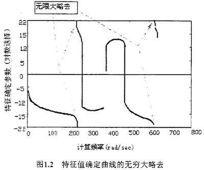 Pilkey和Leckie開發(fā)的用于分析帶分支系統(tǒng)扭振系統(tǒng)的傳遞矩陣法包括將分支系統(tǒng)簡化為一個等效單轉子系統(tǒng)。這種方法要求將分支系統(tǒng)的參數(shù)累加在分支系統(tǒng)所屬的軸段上。因為這種方法要求從主傳遞矩陣上消去分支系統(tǒng)的狀態(tài)關系,這會導致用根搜索法求解時丟到合理的根。如下圖1-2所示的一個頻率范圍內(nèi)的分支系統(tǒng)的特征曲線,因為無限大而略去的特點會導致丟根。