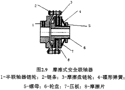 圖2.9 就是摩擦安全聯(lián)軸器的一種型式。工作時(shí)由主動(dòng)軸帶動(dòng)輪盤(pán)6,鏈輪3夾在兩摩擦片之間,摩擦片的壓緊力由壓板7,碟形彈簧4及調(diào)節(jié)螺母調(diào)節(jié)。如果傳遞的轉(zhuǎn)矩不大于摩擦片與鏈輪之間摩擦力所能產(chǎn)生的極限轉(zhuǎn)矩,鏈輪3 可通過(guò)雙排滾子鏈2將轉(zhuǎn)矩傳給半聯(lián)軸器鏈輪1(與被動(dòng)軸聯(lián)接),實(shí)現(xiàn)扭矩的傳遞。